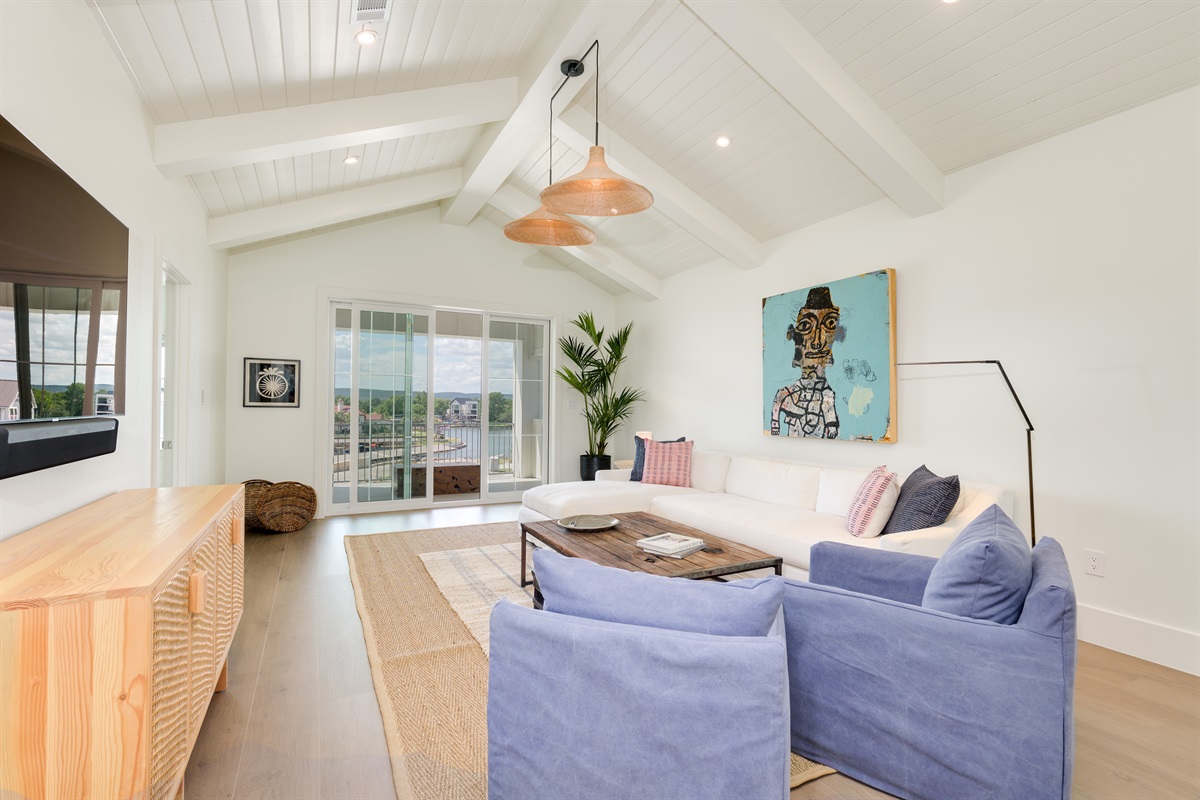 Upstairs through the barn door, you will find another living space with beverage refrigerator, Smart TV, and Sonos sound system. Beyond the living space is a balcony to relax and unwind from the day of activities.